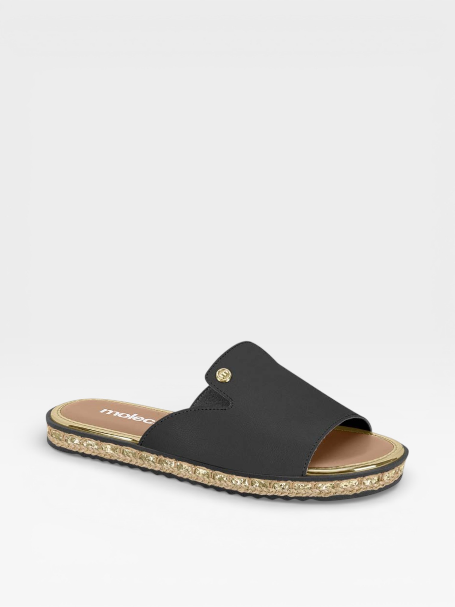 Um modelo que une praticidade e charme. Essa rasteira slide conta com cabedal em tira única larga e solado com acabamento trançado e detalhe em brilho, que garante um visual moderno e sofisticado. Confortável e versátil, é ideal para compor produções casuais com muito estilo no dia a dia.
