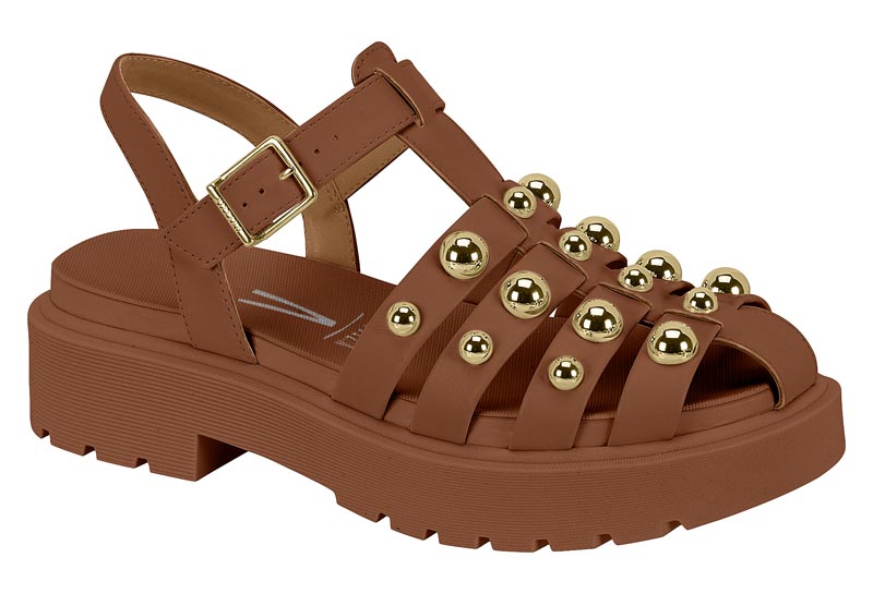Sandália de tiras largas com acabamento em detalhes metálicos que adicionam um charme especial ao modelo. Conta com fecho ajustável para melhor encaixe no pé e solado robusto, ideal para uso diário com conforto e estilo.