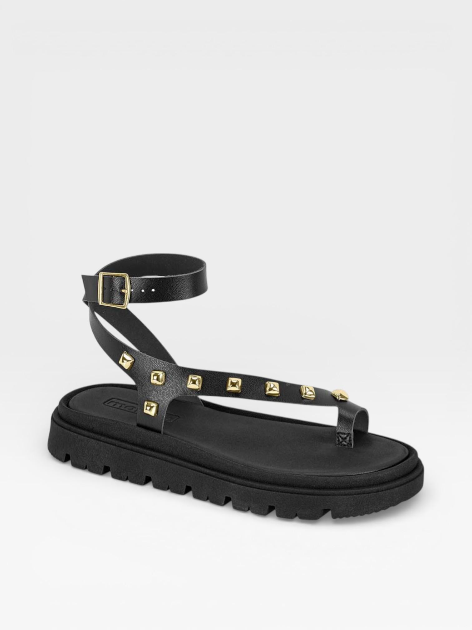 As tiras com aplicação de tachas adicionam um toque estiloso e contemporâneo ao calçado, valorizando o design e deixando o look ainda mais interessante. Além disso, o modelo oferece ajuste confortável aos pés, proporcionando segurança ao caminhar.