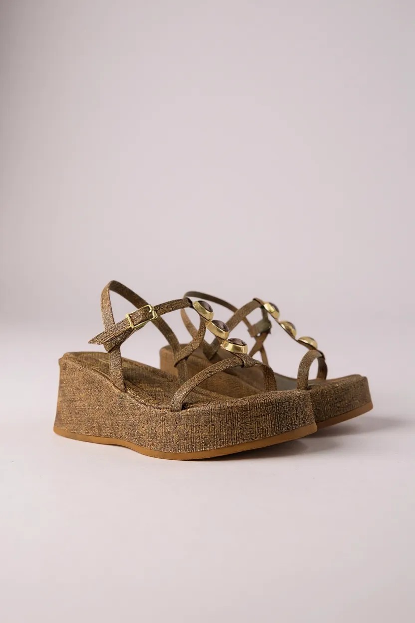 Sandalia Anabela Plataforma Tira Com Adorno Marrom Linho