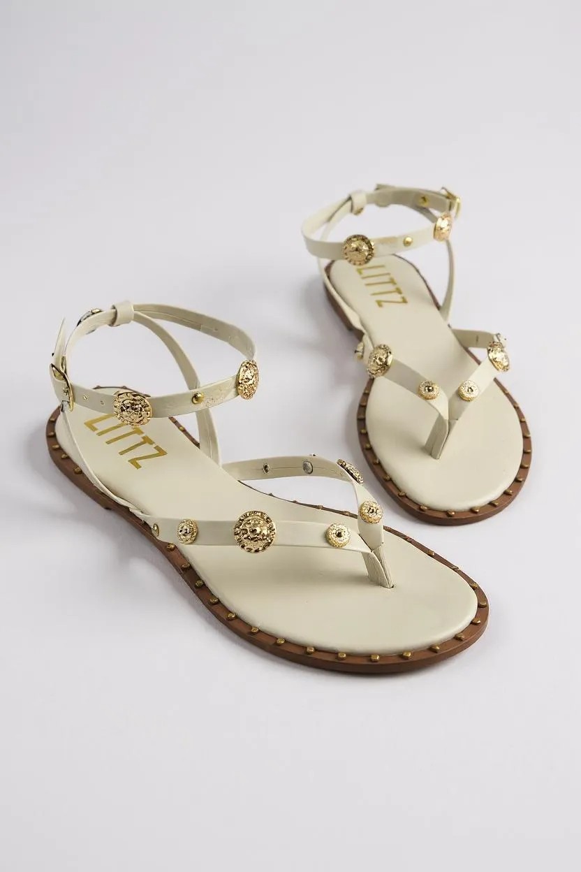 Sandália Feminina Littz Rasteira Tiira E Fivela Off White/Ouro
