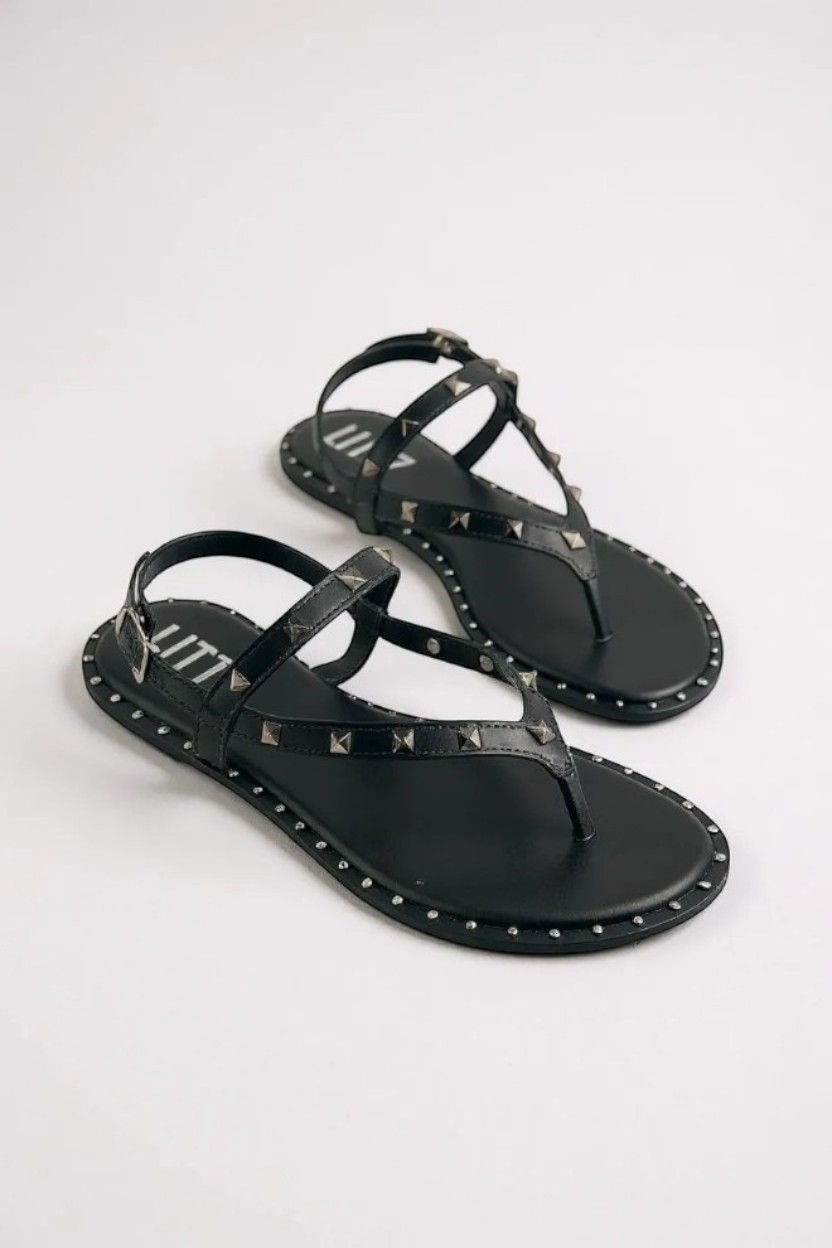 Sandália Feminina Littz Rasteira Tira Com Spikes E Fivela Preto/Onix