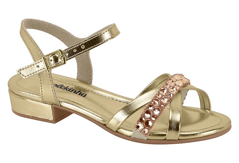 Sandália Infantil Com Pedrarias E Salto Baixo Dourado