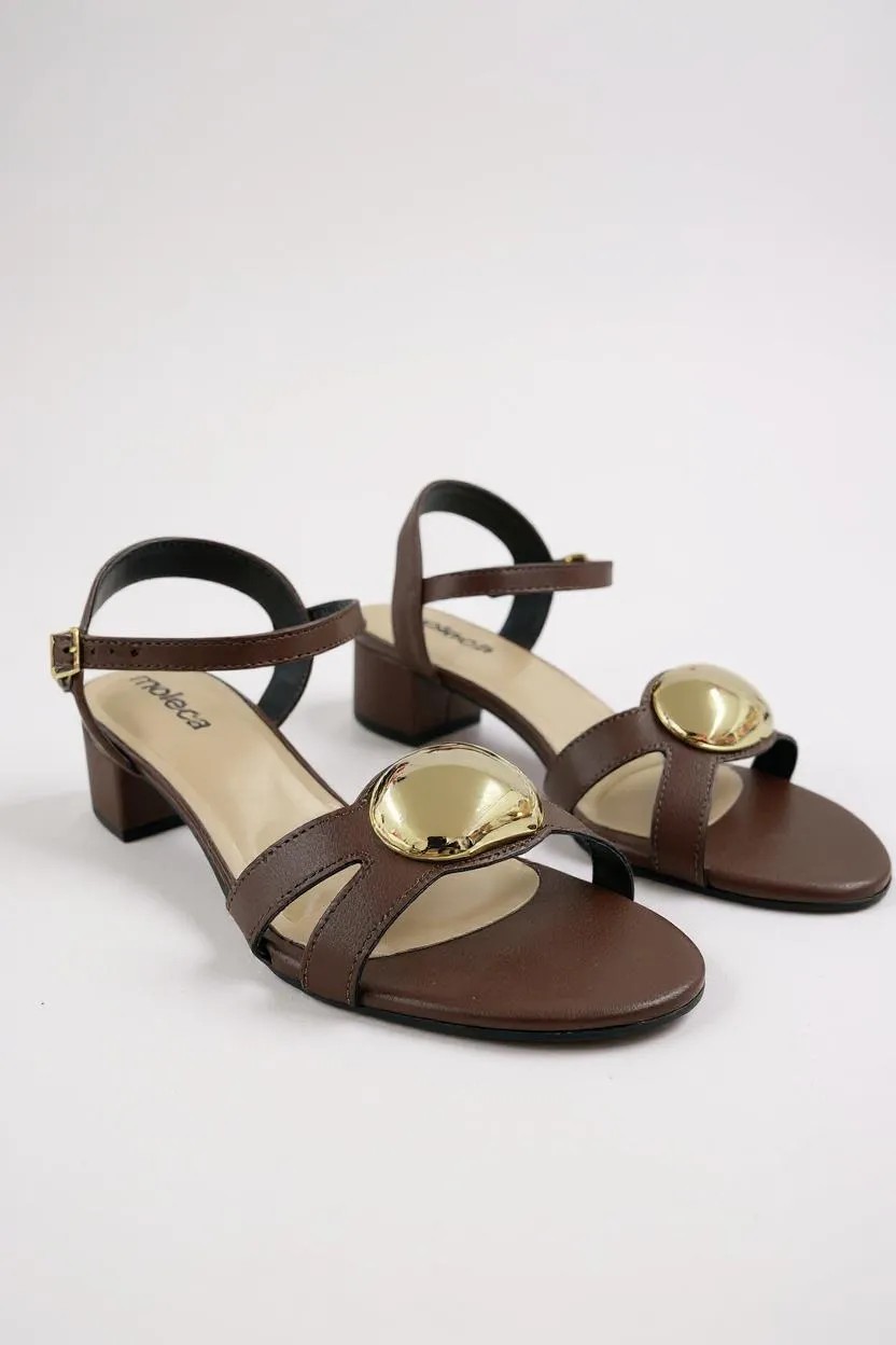 Palavras-chave: sandália moleca, sandália com saltinho, sandália confortável, sandália feminina elegante, sandália marrom com detalhe dourado.