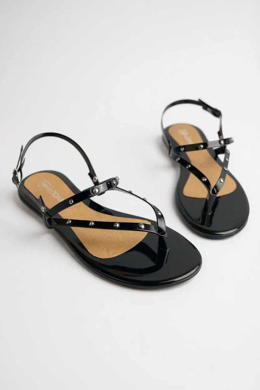 Sandalia Rasteira Addan Tiras Com Taxinhas Preto Verniz