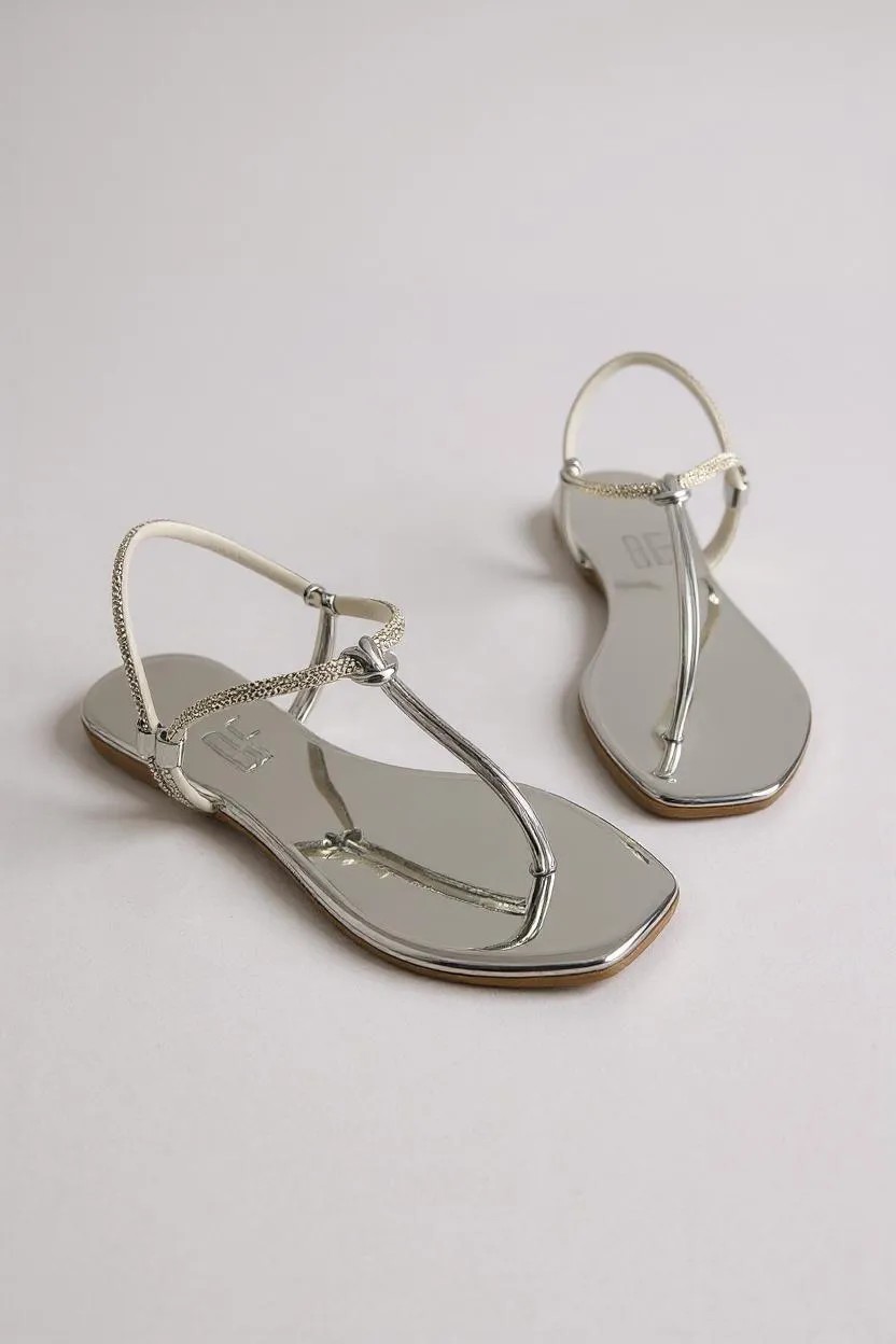 A sandália rasteira Anna Flor é puro charme com seu acabamento metalizado e tiras com strass brilhante.