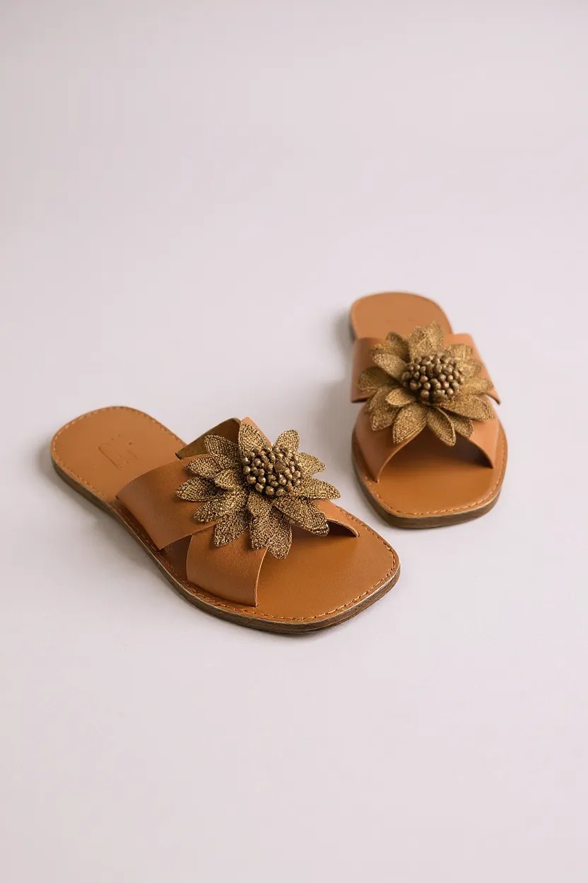 Para quem busca charme e autenticidade, esta rasteira feminina em couro sintético é a escolha ideal. O modelo apresenta tiras largas e cruzadas que garantem conforto e firmeza ao caminhar. O grande destaque fica por conta da flor em alto-relevo na parte superior — feita com pétalas douradas texturizadas e miolo detalhado — que transforma o calçado em uma peça única e cheia de personalidade. Uma opção perfeita para looks de verão, passeios ao ar livre e momentos descontraídos com estilo.
