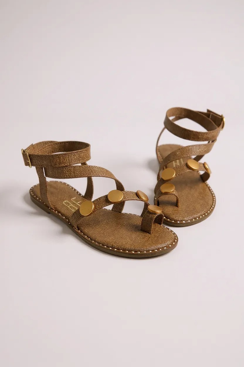 Sandália Rasteira Feminina Com Tiras Cruzadas E Aplicações Douradas Caramelo Linho