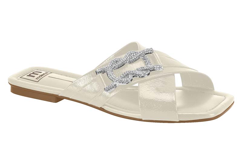 Sandalia Rasteira Feminina Com Tiras Cruzadas E Fivela Brilhante Branco Off