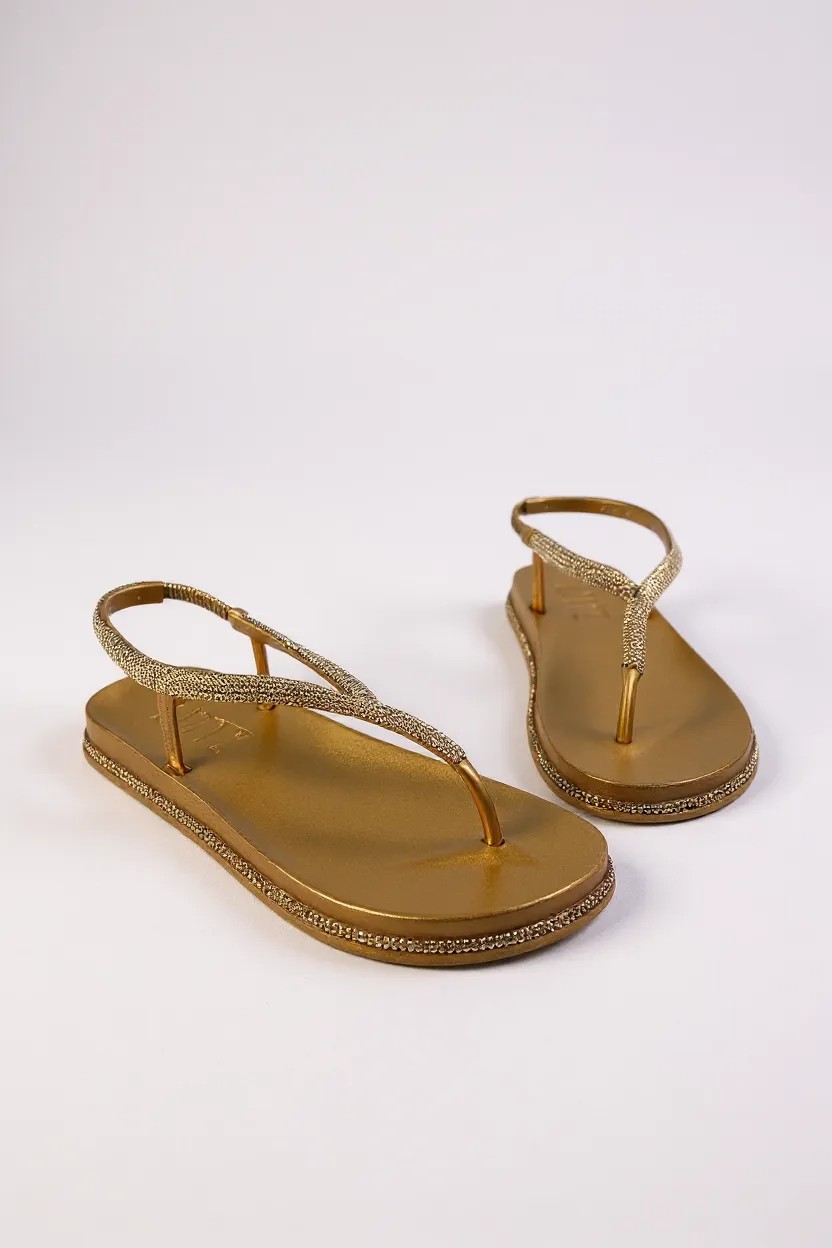 Sandália Rasteira Feminina Com Tiras E Solado Brilhantes Cobre