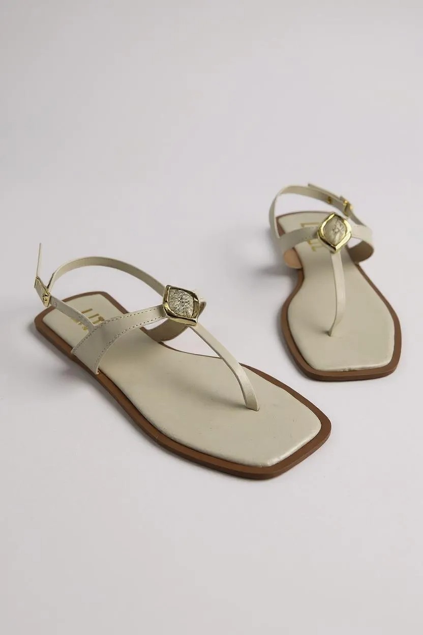 Sandalia Rasteira Feminino Littz Com Fivela E Pedraria Off White/Off White/Ouro