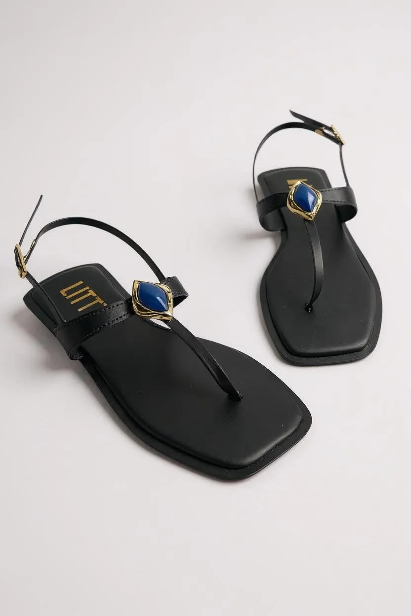 Sandalia Rasteira Feminino Littz Com Fivela E Pedraria Preto/Turquesa/Ouro