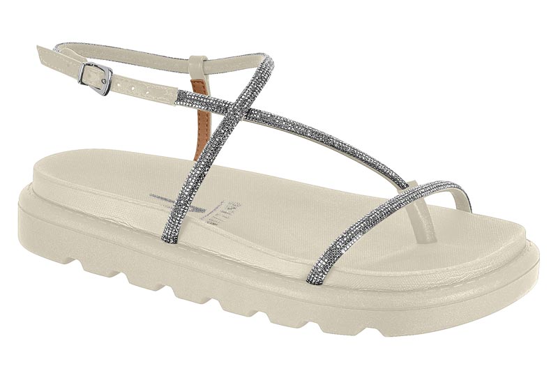 Sandália feminina com tiras finas cruzadas e detalhes brilhantes que trazem um toque de elegância ao visual. O modelo possui fechamento com fivela ajustável, oferecendo um ajuste seguro e confortável. Ideal para compor produções leves e sofisticadas em qualquer ocasião.