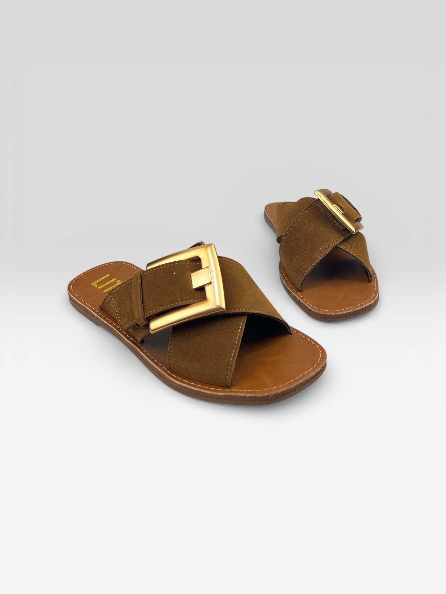 Sandália Rasteira Feminina Com Fivela Metal Carvalho/Ouro Fosco