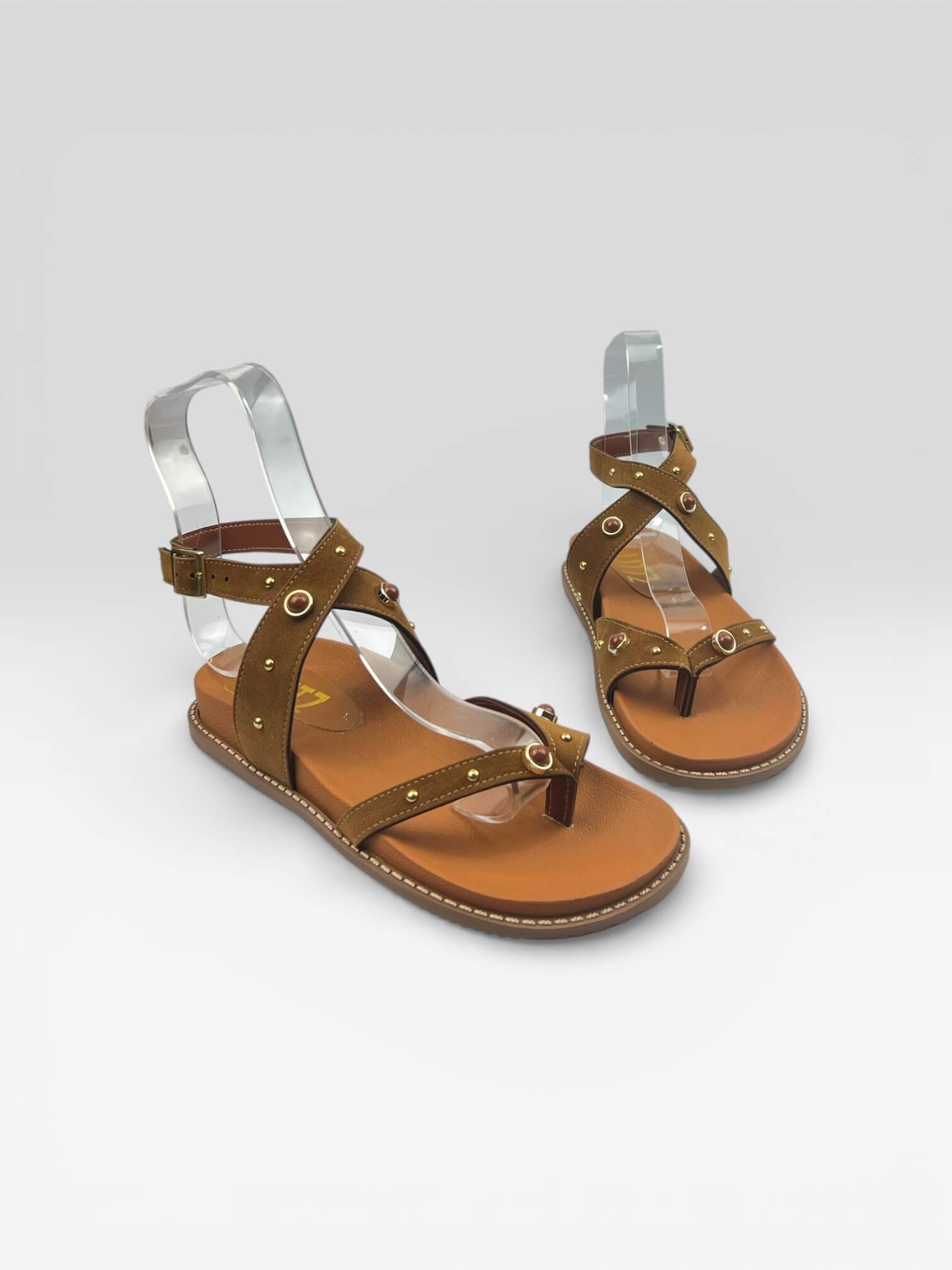 Sandália Rasteira Feminina Com Tiras E Tachas Camurca Carvalho/Caramelo