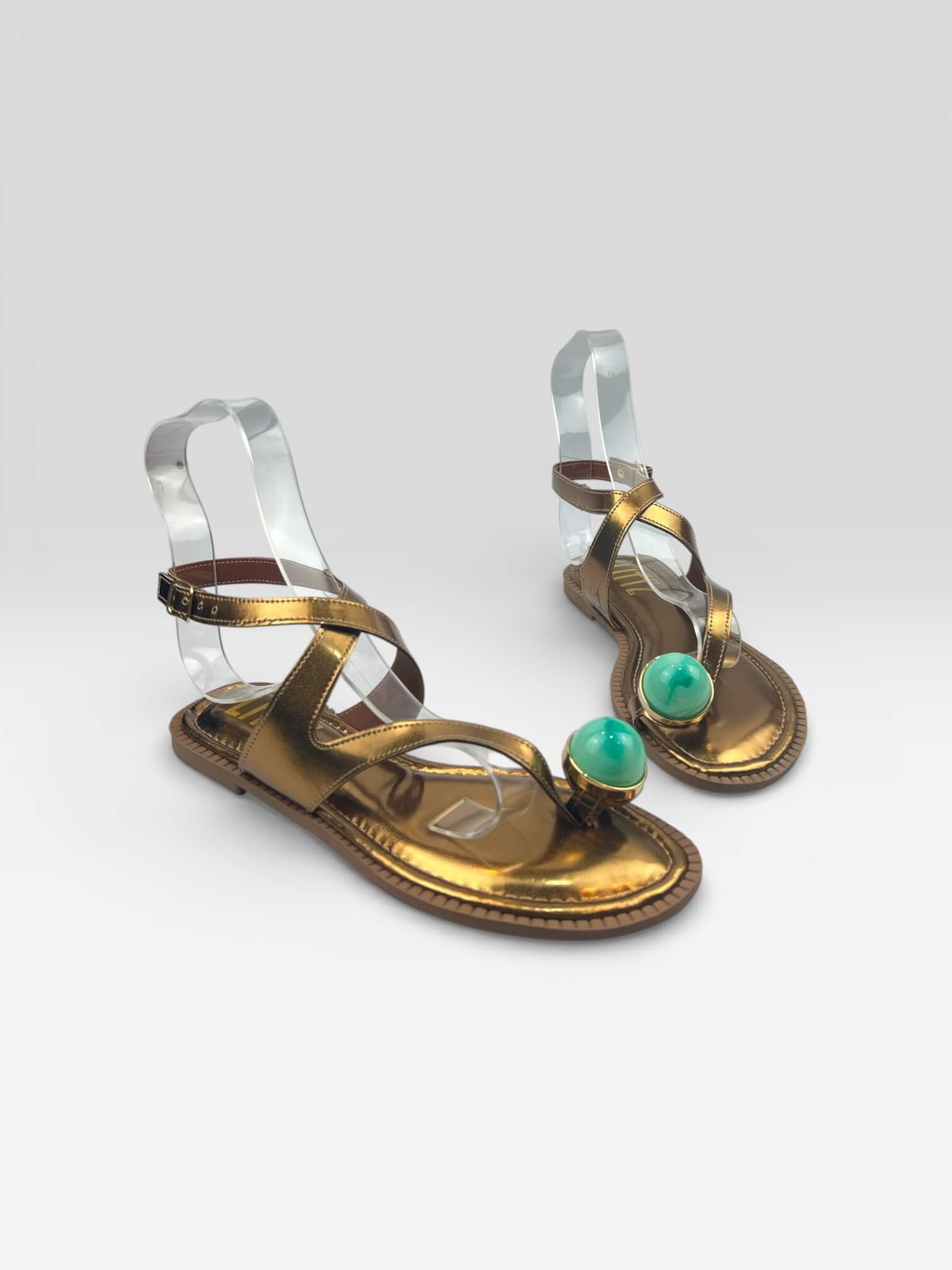 Sandália Rasteira Feminina Metalizada Com Pedra Bronze