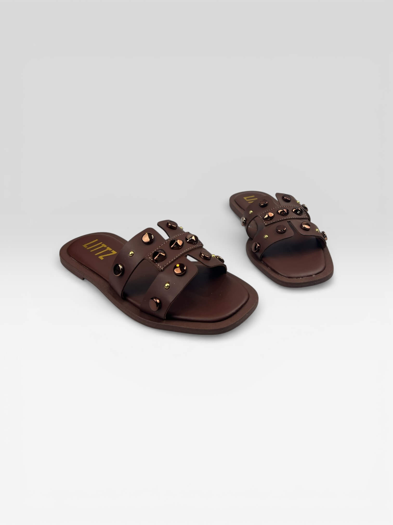 Sandália Slide Feminina Com Tachas Decorativas Marrom