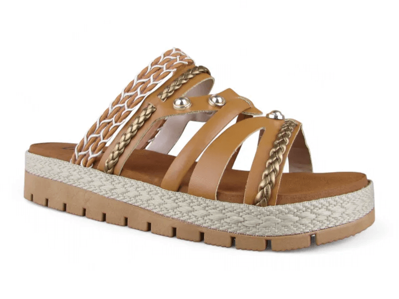 Tamanco Flat Littz Calce Facil Tiras Trançadas Metalizada Tachas Douradas Carvalho