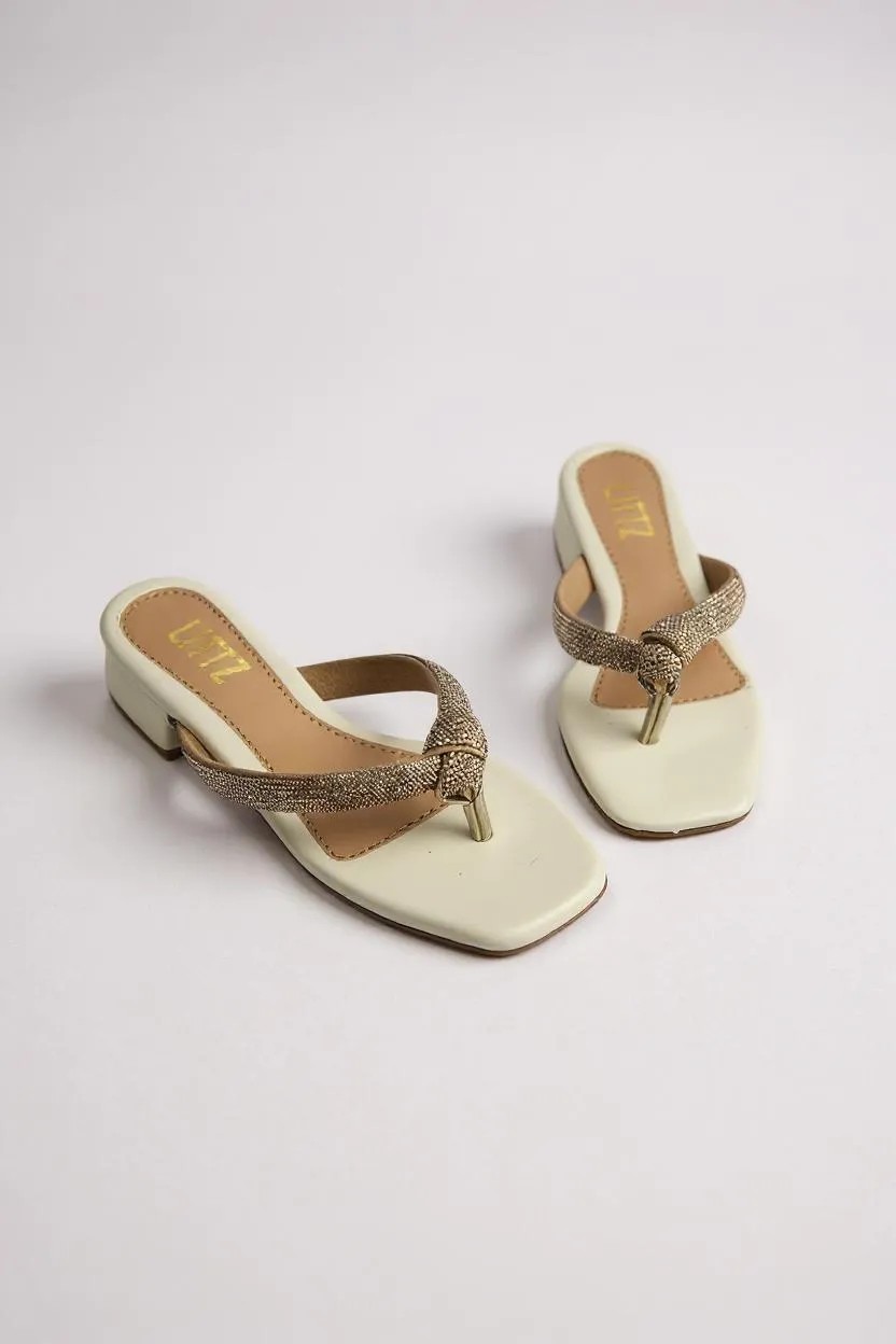Tamanco Moleca Com Salto Médio E Tira Nó Estilo Rasteira Confortável Branco Off